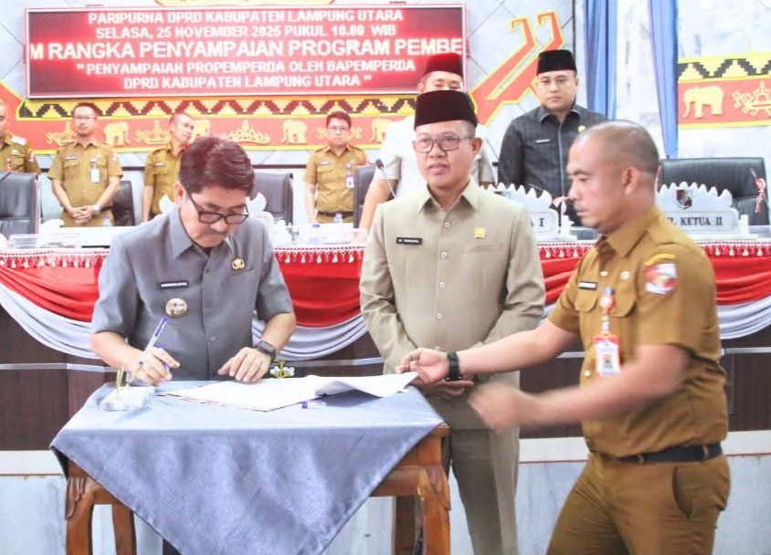 LAMPUNG UTARA – DPRD Lampung Utara menggelar Paripurna Pengesahan Program Pembentukan Peraturan Daerah ( Propemperda) dan Rancangan Nota Keuangan dan Raperda tentang Anggaran Pendapatan dan Belanja Daerah (APBD) Tahun Anggaran 2026, Selasa (25/11/2025).